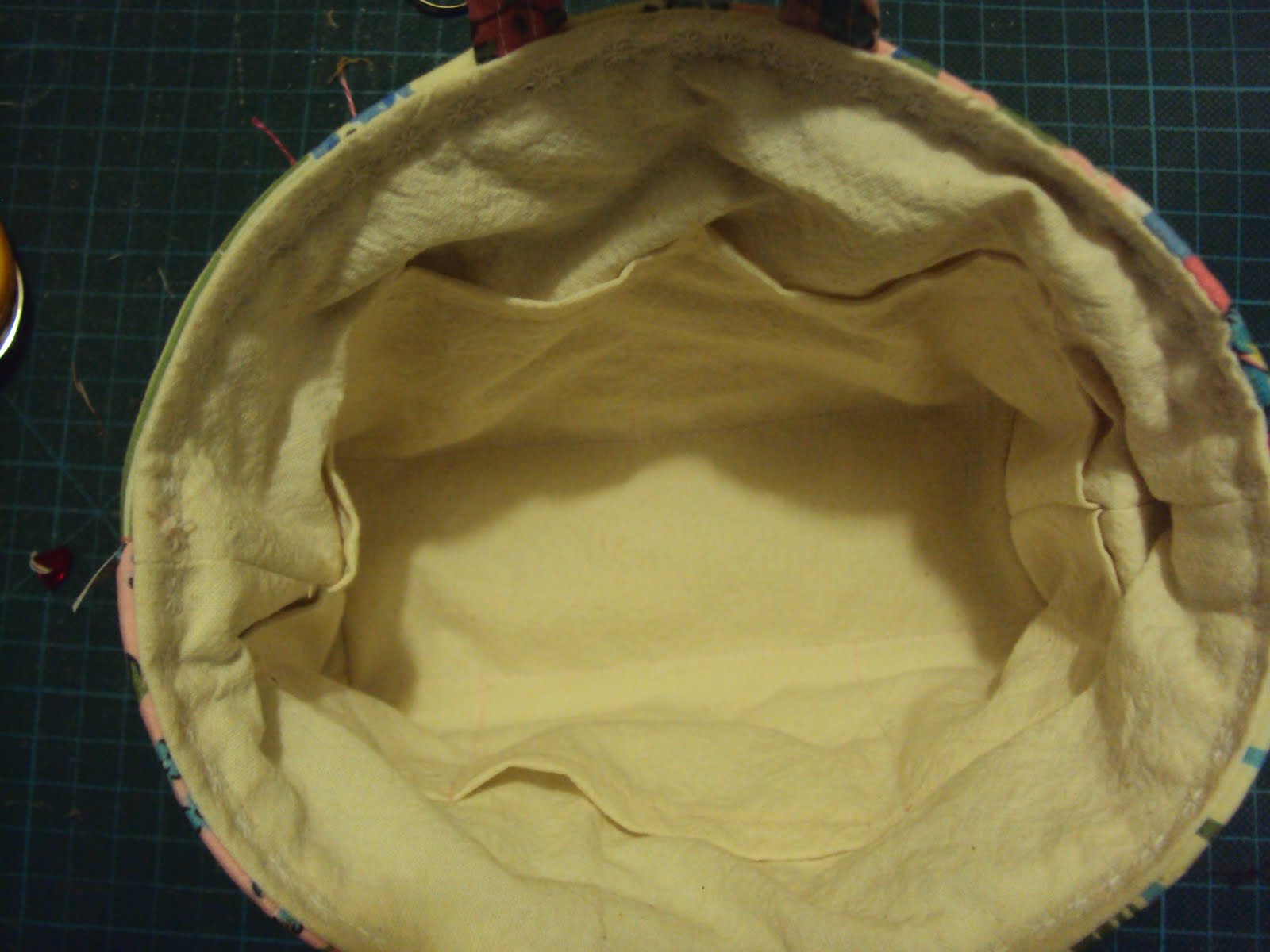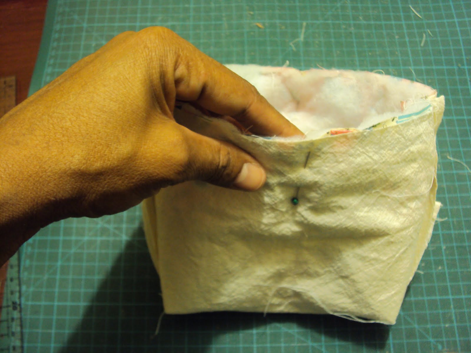 ajuste bem as laterais do organizador com as laterais do forro, abrindo as costuras