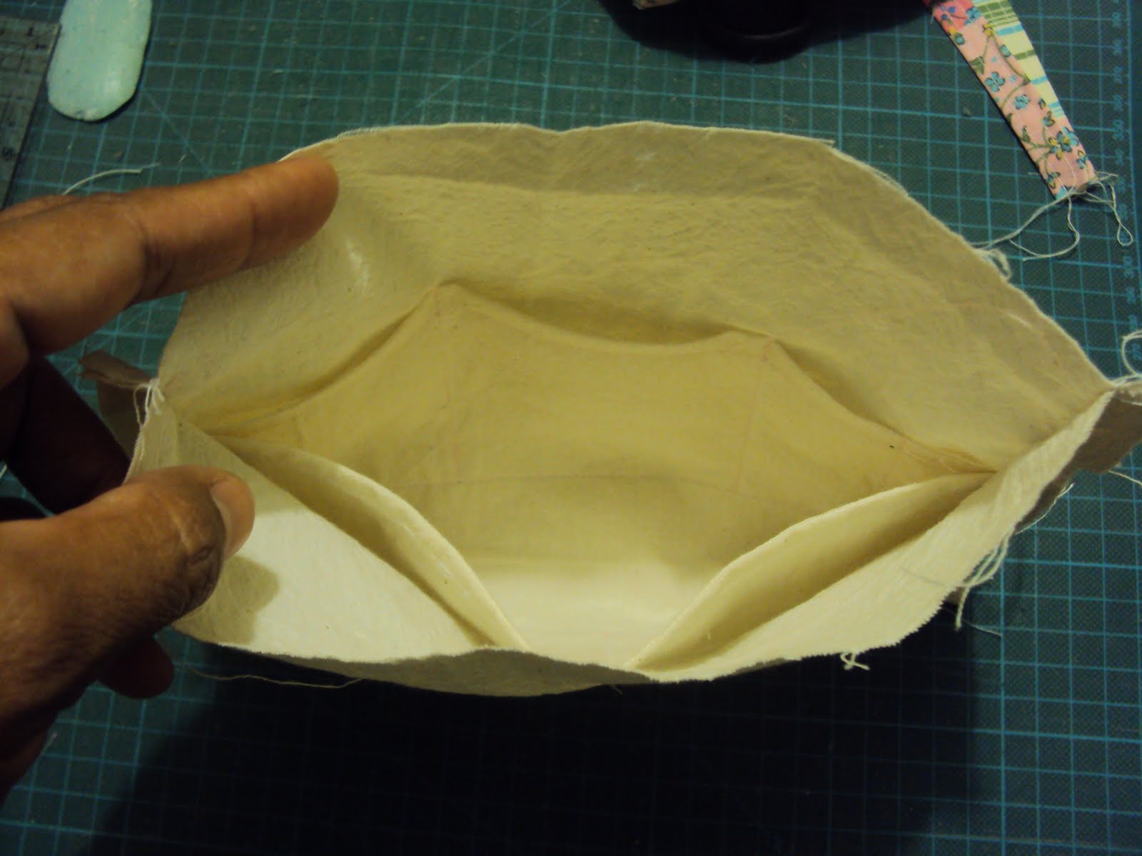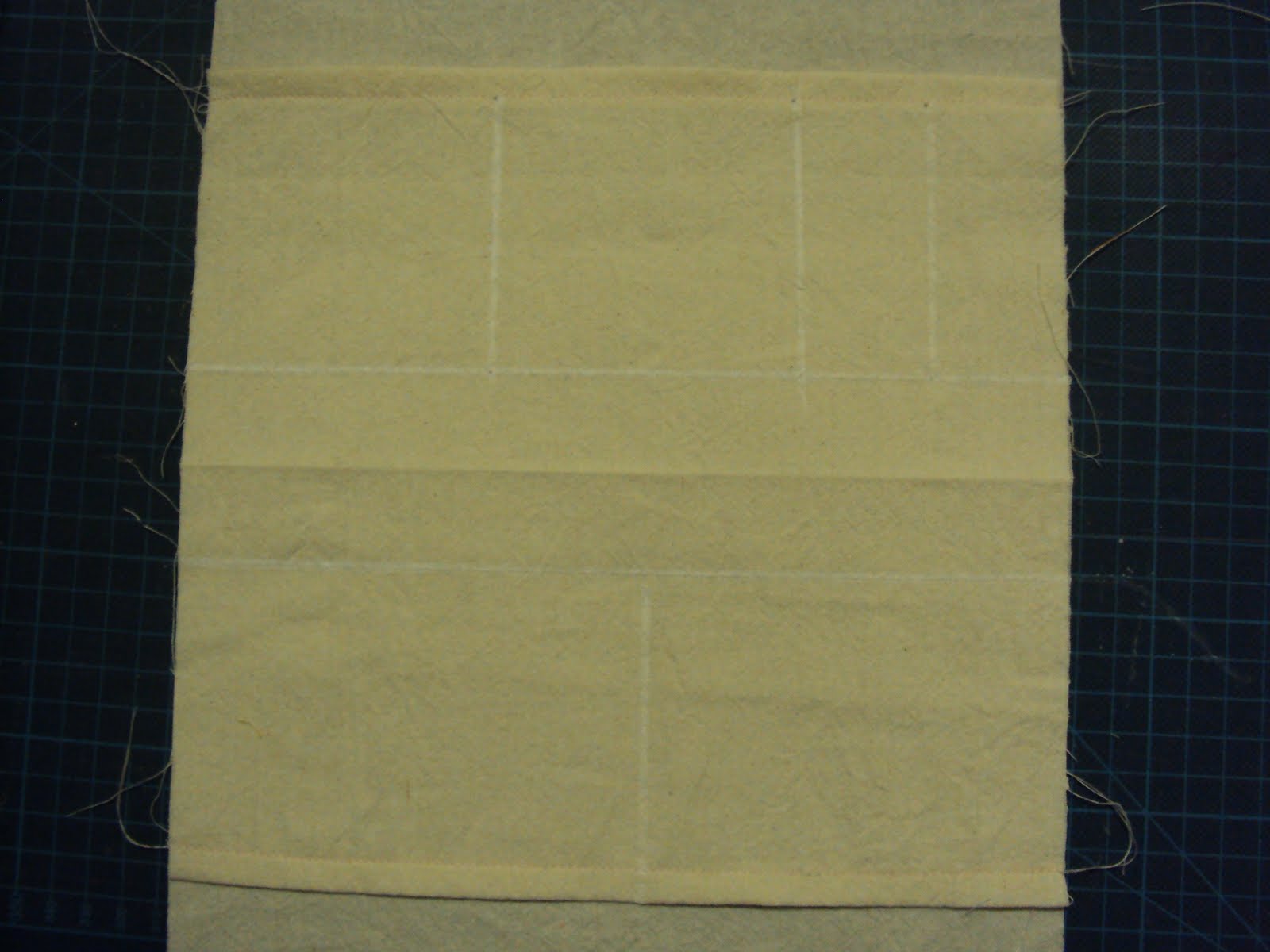 centralize o retângulo menor em cima do retangulo maior ... note que no centro tem o vinco, meça 2,5cm acima e 2,5 abaixo do vinco o que dará 5cm de fundo e passe uma costura nas duas linhas horizontais marcadas com giz de alfaiate ou sabonete bem fininho, faça também as divisões e passe uma costura em cada divisão